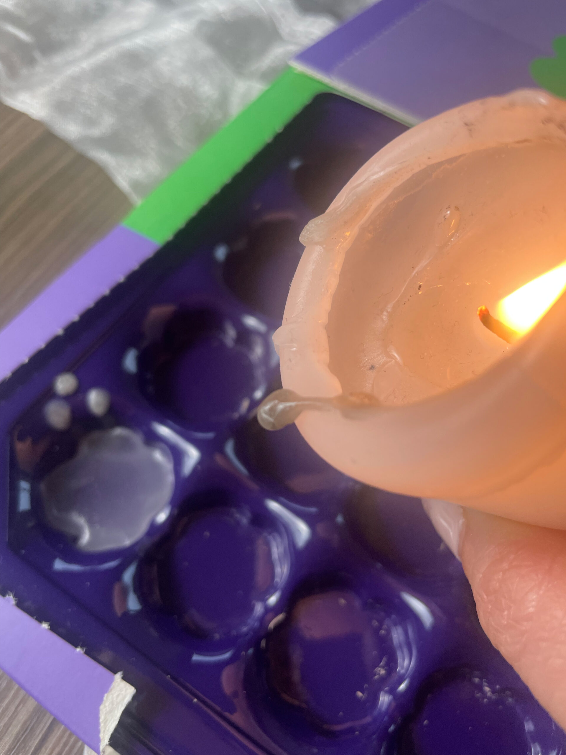 - Richte dir dein Wachs oder Kerzenreste hin. Du kannst auch falls du deinen Schoko-Adventskalender noch hast die Formen mit Wachs füllen, das geht natürlich auch mit den Formen einer Pralinenschachtel.